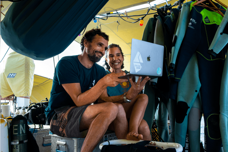 Lors des expéditions Under The Pole, les membres de l'équipage réalisent des visio‑conférences en direct pour partager leurs missions et les découvertes scientifiques.